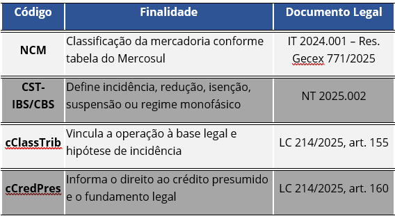 A padronização do XML também cria uma nova lógica de identificação fiscal. Quatro códigos passam a ser o eixo técnico da apuração sob o novo modelo: o NCM, o CST-IBS/CBS, o cClassTrib e o cCredPres.